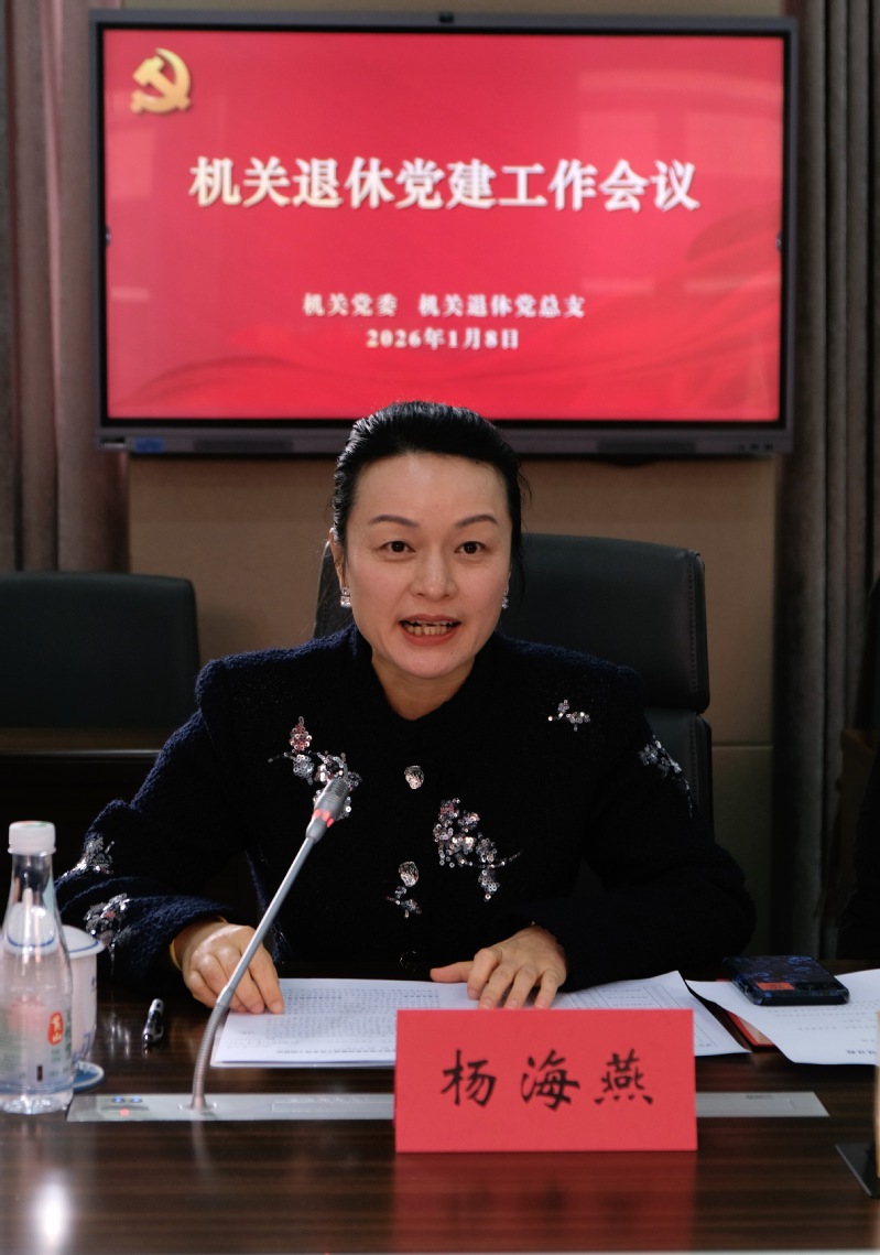 杨海燕首先代表学校党委向在机关退休党建一线辛苦付出的机关退休党总支、各党支部支委班子成员以及每一位坚守初心的退休老党员表示诚挚的感谢!她指出,退休老领导、老党员们,是学校发展的奠基人、育人事业的先行者;退休后依然以坚定的党性、饱满的热情投身党建工作,用实际行动诠释了“离岗不离党、退休不褪色”的政治本色,为学校党建工作高质量发展注入了宝贵的银发力量。她谈到,一年以来,机关退休党总支紧紧围绕新时代党的建设总要求,结合高校退休党建实际,政治建设统领全局,理论武装走深走实;组织建设夯实根基,战斗堡垒更加坚固;服务保障精准暖心,银发力量赋能发展,以强烈的责任担当支持学校发展,以深厚的为民情怀服务身边党员群众,扎实有效地推动机关退休党建各项工作,成效显著、特色鲜明。她希望机关退休党建工作要结合退休党员实际特点,进一步提质增效;同时也请老前辈们在学校“十五五”规划、“一校一策”综合改革工作中积极建言献策。